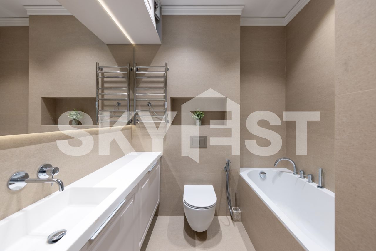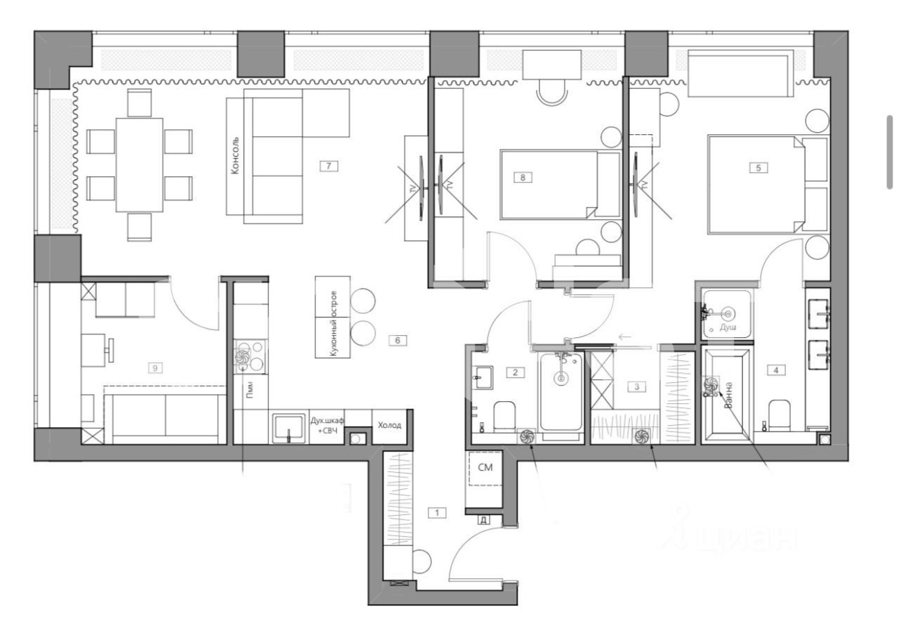 Планировка: кухня-гостиная, 3 спальни, ванная, гостевой санузел, постирочная, холл.
