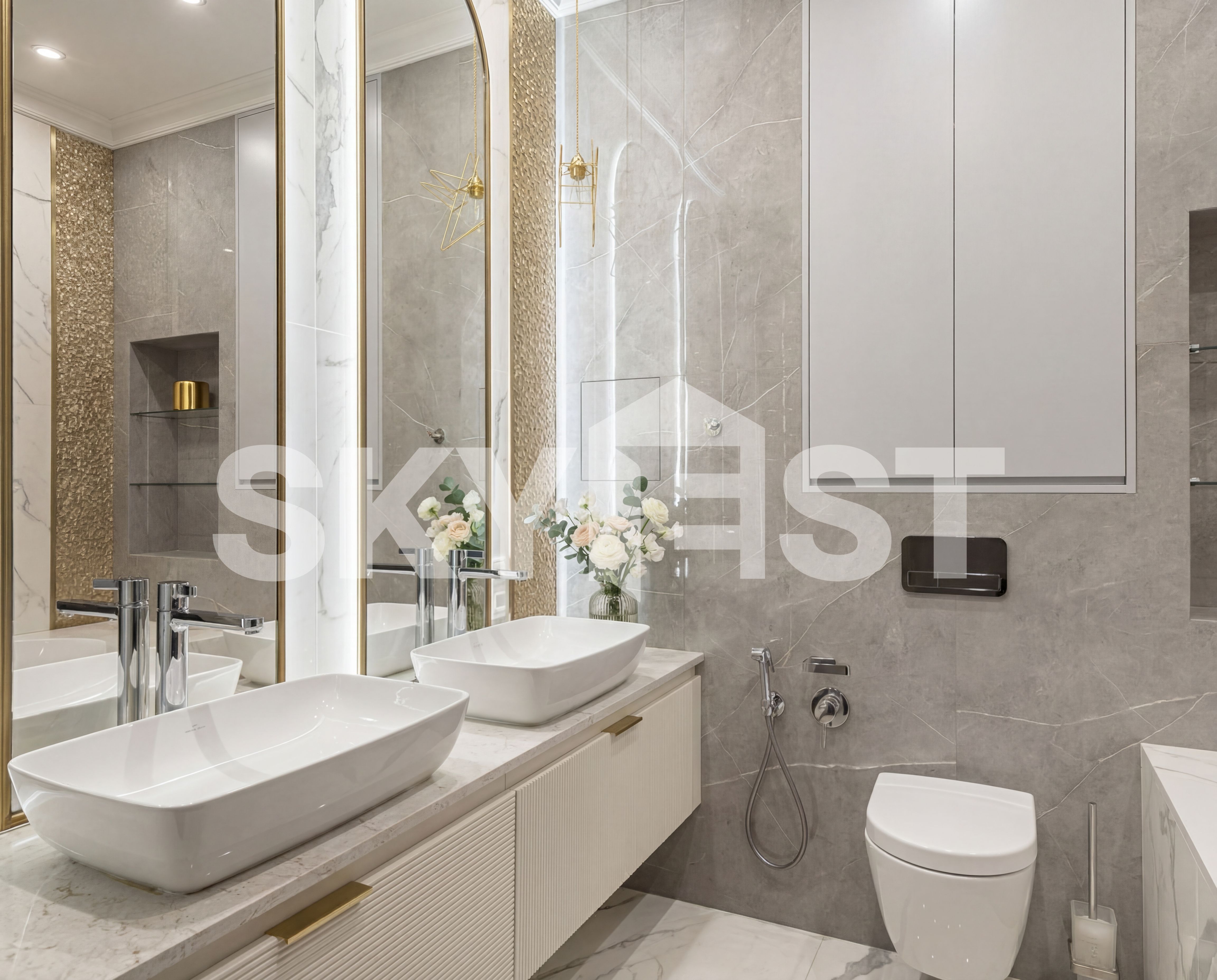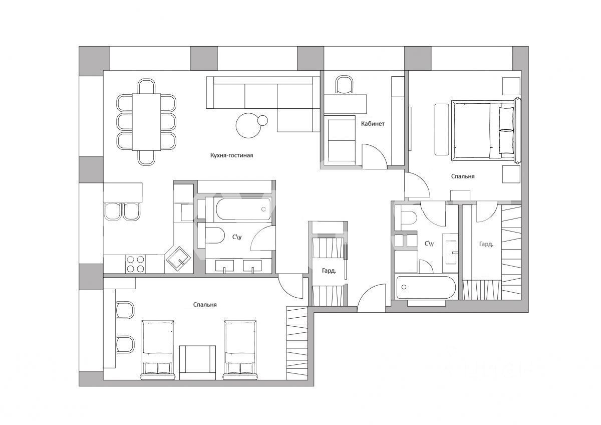 Планировка: кухня-гостиная, 2 спальни, кабинет, 2 ванные, гардеробная, холл.