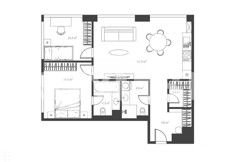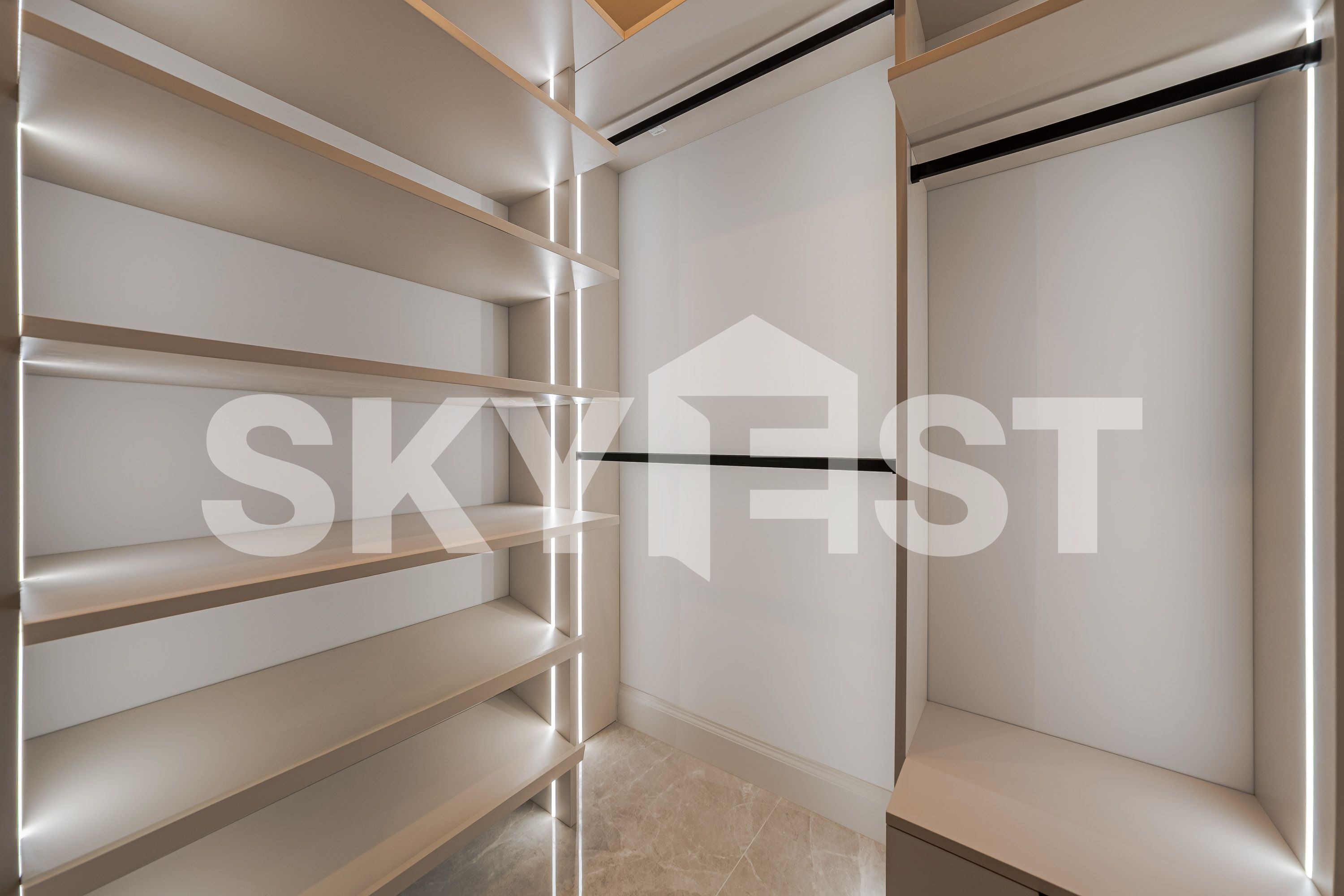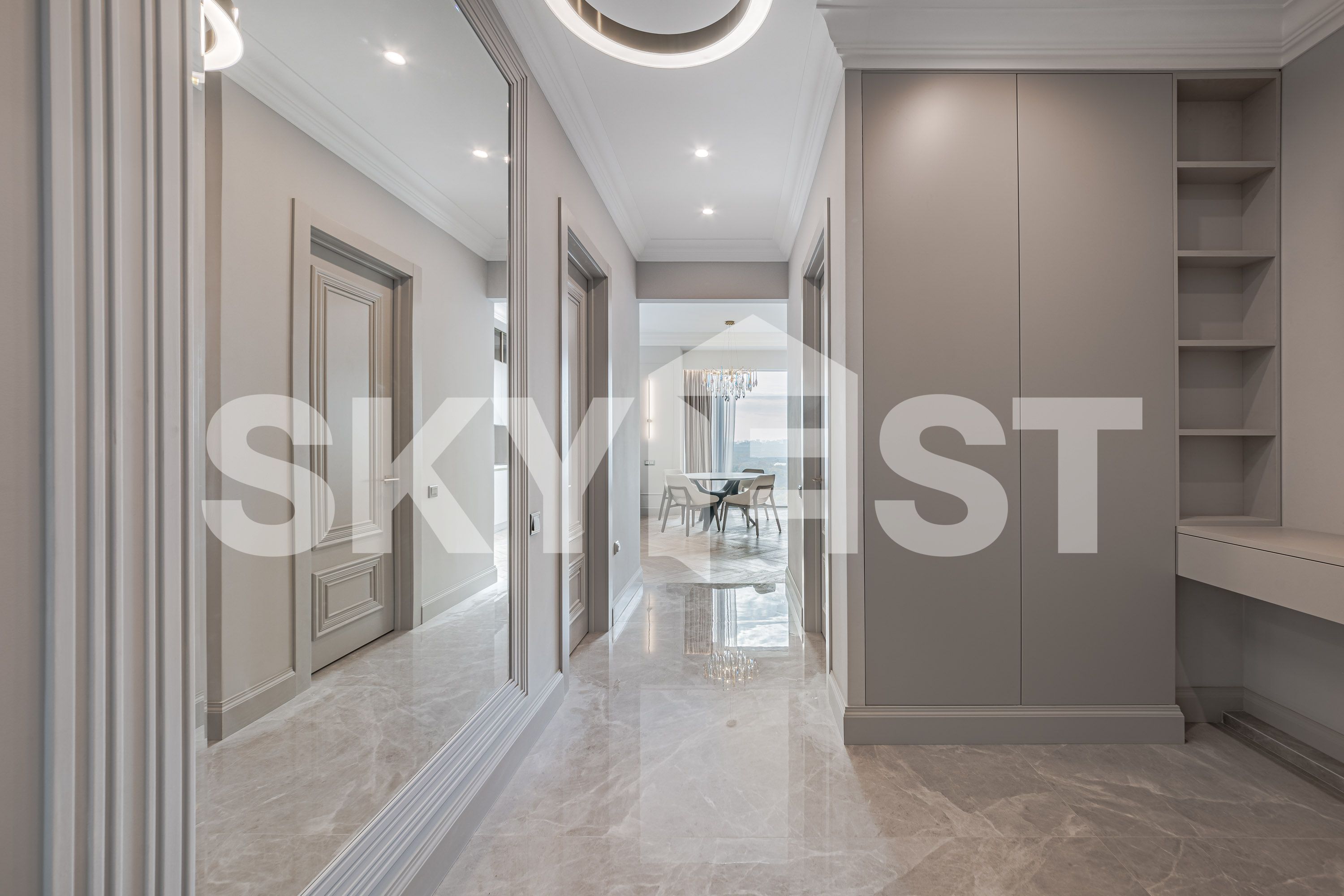 Планировка: кухня, гостиная, 2 cпальни, ванная комната, гостевой санузел, гордеробная, холл.