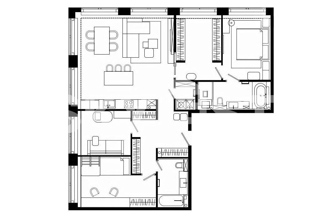 Планировка: кухня-гостиная, 3 спальни, 2 ванные комнаты, гардеробная, постирочная.