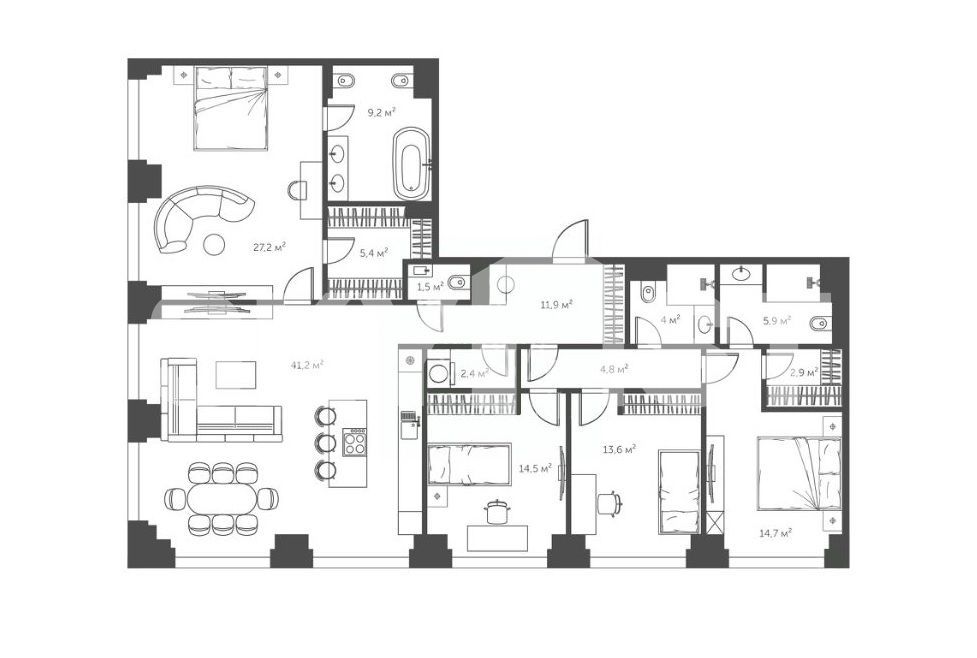 Планировка: кухня-гостиная, мастер-спальня с собственной гардеробной и ванной комнатой, 3 спальни, гардеробная, 2 санузла, постирочная.